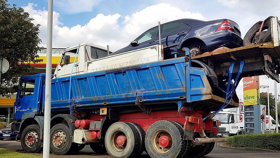 Der Kipper-Lkw hatte auf seiner Ladefläche einen Transporter geladen, auf dessen Ladefläche wiederum ein Mercedes-Pkw stand. Das Ungetüm stand in der Nähe einer Tankstelle.