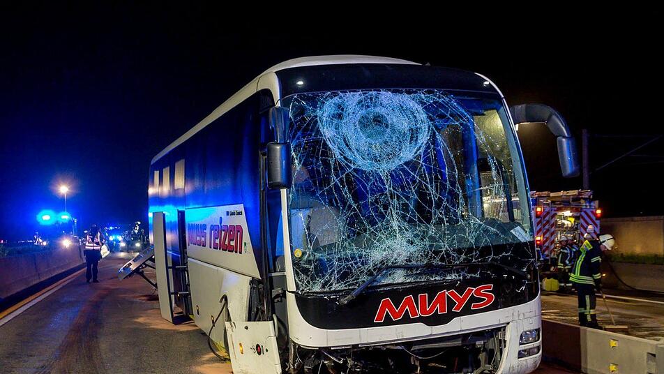 BEi einem Unfall eines Reisebusses auf der A3 bei Wiesbaden (Hessen) sind 13 Menschen verletzt worden. Wie die örtliche Polizei berichtet, prallte der Bus in der Nacht zum Freitag (25. Mai 2018) in einem Baustellenbereich gegen einen Fahrbahnteiler aus Beton. Der Bus geriet nach links und blieb anschließend quer auf der Fahrbahn der A3 stehen. Warum der Bus gegen den Pfeiler crashte, ist derzeit noch unklar. Durch den Aufprall gegen den Pfeiler, wurden die Benzintanks des Busses aufgerissen. Sprit verteilte sich auf der Autobahn. Zwölf der Insassen sowie der 66-jährige Busfahrer wurden verletzt. Elf der Verletzten wurden in umliegende Krankenhäuser gebracht. Die restlichen Reisenden wurden mit einem weiteren Bus zu ihrem Zielhotel in Offenbach gebracht.