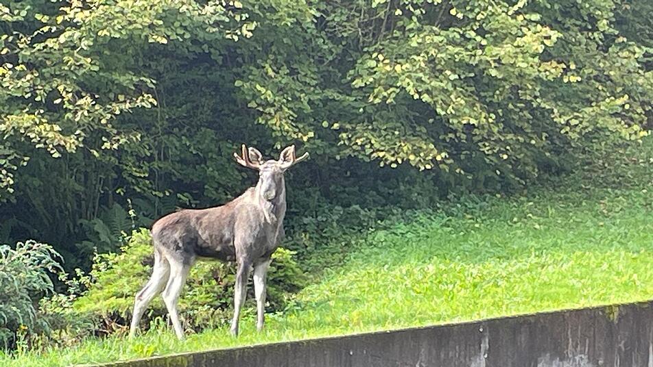 Ein Elch hat im Schwarzwald für Aufsehen gesorgt und hat der Anwohnerin Rosi Friske ein ganz spezielles Erlebnis beschert. Sie konnte das beeindruckende Tier direkt vor ihrem Haus in Oberwolfach (Ortenaukreis) fotografieren und filmen - sogar auf ihrer Garage. Dabei beobachtete sie auch, wie der Elch mit einem Elektrozaun an einer Viehweide Bekanntschaft machte.