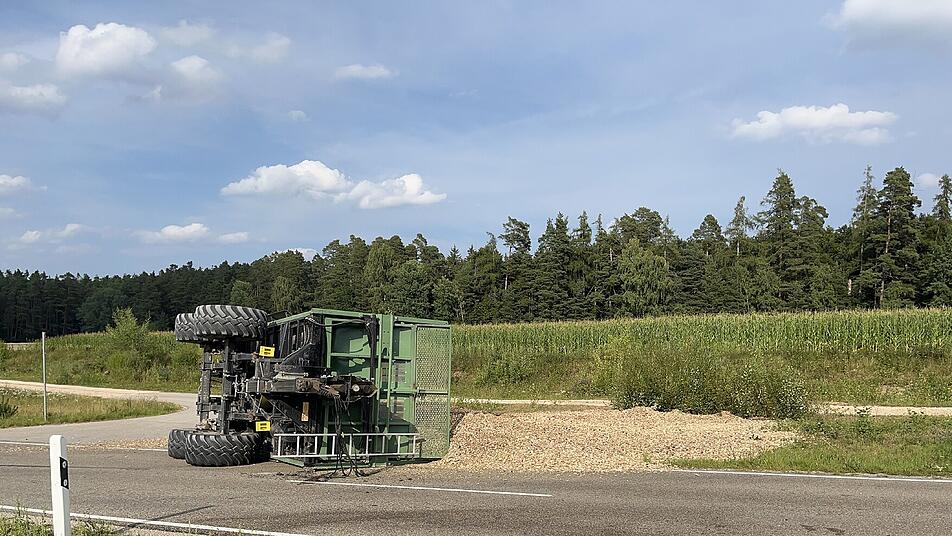 Ein umgekippter Traktor hat in Petersaurach (Kreis Ansbach) für eine Straßensperrung gesorgt. Laut Polizei fuhr ein 18-Jähriger am Samstagnachmittag (16. August 2025) gegen 17.25 Uhr mit seinem Gespann von einem Flurbereinigungsweg auf die Staatsstraße 2412 - passte dabei aber seine Geschwindigkeit nicht an. In einer Kurve kippte der Anhänger samt Ladung um, meldet die Polizei Heilsbronn.