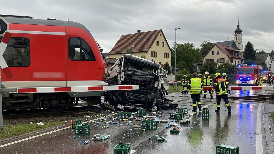 Der mit Getränken beladene Lkw stand den ersten Angaben zufolge am Freitagmorgen (22. August 2025) gegen 7.45 Uhr aus zunächst unbekannten Gründen auf den Schienen, als die Schranken heruntergingen. Der Regionalzug der Kahlgrundbahn auf dem Weg von Alzenau nach Mömbris konnte nicht mehr rechtzeitig stoppen und stieß frontal mit dem Anhänger zusammen. Der Anhänger des Lasters kippte durch den Zusammenstoß um. Die Strecke der auch "Bembelbahn" genannten Linie von Kahl nach Schöllkrippen wurde nach Angaben der Polizei für mehrere Stunden komplett gesperrt.