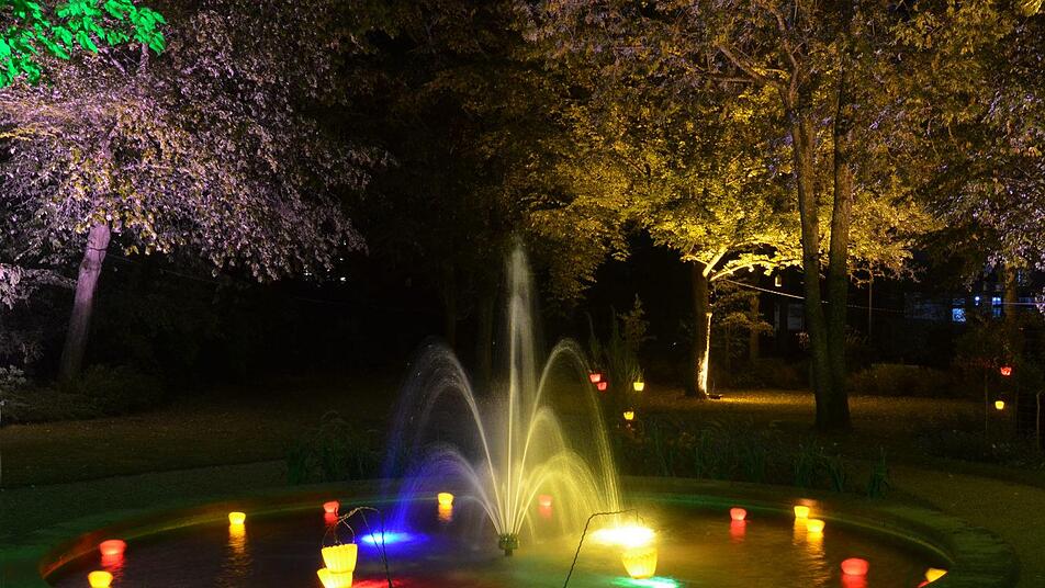 Und so verwandelte sich der Kurgarten in einen wahren Zauberwald. Abseits des mit Lampions geschmückten Hauptweges tauchte farbiges Licht die Bäume in eine romantische Atmosphäre. Bunte Lampions schwammen auf den beiden erleuchteten Springbrunnen, ansonsten herrschte Dunkelheit im Park. Nur vor dem Brunnenbau, wo die Bläservereinigung Burkardroth aufspielte, waren zwei Scheinwerfer für die Musiker aufgestellt.