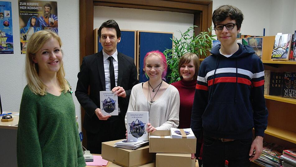 Ab sofort, für jeden frei verfügbar, liegt nun die vom P-Seminar entworfene Broschüre "Jüdisches Leben in Brückenau" vor, die die Schüler in 1000-facher Auflage Bürgermeisterin Brigitte Meyerdierks (CSU) und Bibliothekar Jan Marberg übergeben haben. "Wir unterstützen das gerne," betonte Jan Marberg, ist doch die Bibliothek ein "Wissensspeicher. Wir haben die Aufgabe, Erinnerung und Mahnung zu bewahren." Bürgermeisterin Brigitte Meyerdierks freute sich über das Engagement der Schüler und über den "weiteren Schritt, den wir gehen". Bereits im vergangenen Jahr hatte sie die Gymnasiasten kennengelernt, als diese die Verlegung von Stolpersteinen erneut auf die Tagesordnung des Stadtrates gebracht hatten. War das Thema vor knapp zehn Jahren abgelehnt worden, im vergangenen Jahr konnten die Jugendlichen überzeugen. Auch die Rathauschefin war anfangs "kritisch" zur Stolpersteinverlegung eingestellt gewesen. Doch "muss honoriert werden, wenn sich junge Menschen mit einem Thema so tief beschäftigen. Ich habe zugestimmt, um der Arbeit Respekt zu zollen."