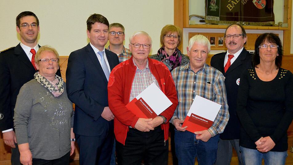 100mal haben gespendet Norbert Borst, Elfriede Nöth (beide Oerlenbach), Alexander Kretz (Motten), Thomas Manger (Bad Bocklet), Sonja Metz, Martin Schlereth, Gabriele Schreiner (alle Burkardroth). 125Malige Spender: Norbert Halbig (Burkardroth), Günter Kirchner, Theodor Plener (beide Bad Bocklet), sowie Hans Nuesslein (Euerdorf), der an diesem Abend verhindert war und für 150maliges Blutspenden geehrt werden sollte.