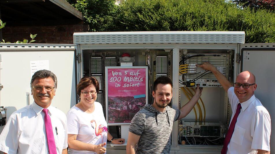 "Das ist ein schöner Tag für die Gemeinde" sagte Patricia Schießer und strahlte. Die Bürgermeisterin des Marktes Euerdorf hat für den Fototermin mit dem symbolischen Knopfdruck, mit dem das schnelle Internet für die "Breet" im Schaltkasten gestartet wird, passend zu den Krawatten der Telekom Manager, extra ein T-Shirt mit Magenta Applikationen angezogen.