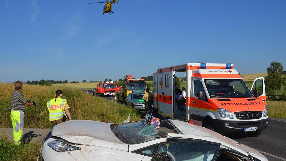 Zusätzlich wurden von der Rettungsleitstelle noch die Feuerwehren Thulba, Frankenbrunn, Hetzlos und Wartmannsroth alarmiert, die sich vorwiegend um die Absperrung der Unfallstrecke bemühten, denn der Rettungshubschrauber Christoph 18 aus Ochsenfurt landete direkt an der Unfallstelle. Er brachte die Fahrerin mit Verdacht auf Rückenverletzungen in eine Klinik nach Würzburg. Nach gut einer Stunde wurde der Verkehr wieder freigegeben. Insgesamt waren seitens der Feuerwehren rund 40 Helfer, einschließlich Kreisbrandrat Benno Metz vor Ort. Das Rote Kreuz war mit Notarzt und Rettungswagen aus Hammelburg, sowie einem Einsatzleiter aus Bad Kissingen vor Ort, dazu kam noch der Rettungshubschrauber.