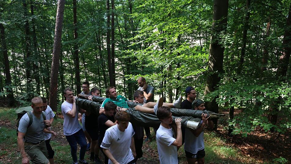 Das romantische Thulbatal hat mit seinen schattigen Wäldern und stillen Tälern ganz eigene landschaftliche Reize. Und doch kann es auch eine echte sportliche Herausforderung sein. An diesem Wochenende stellte sich die Fußballmannschaft des SV Kürnach unter Anleitung von Nadine und Michael Pragmann von "Kommando Ponyhof" aus Frankenbrunn ganz ungewöhnlichen Herausforderungen in freier Natur. Bei der eintägigen Reise ins Ungewisse ging es vor allem darum, das Team an ganz unterschiedlichen Stationen mit kniffligen Aufgaben ins Staunen, Grübeln und Tüfteln zu bekommen. "Die Teilnehmer wissen nie genau, was auf sie zukommt. Letztlich dienen alle Aufgaben dazu, das Team zu formen und neue Talente und ungeahnte Führungsqualitäten zu entdecken", so Michael Pragmann, der als Berufssoldat die Notwendigkeit von guter Teamarbeit kennt. Ganz nebenbei lernen die Teilnehmer auch, mit Karte und Kompass umzugehen und sich mit natürlichen Hilfsmitteln in der Landschaft zurechtzufinden. Beim gemeinsamen Essen am Abend werden dann die Erlebnisse und Erkenntnisse in lockerer Runde ausgetauscht.
