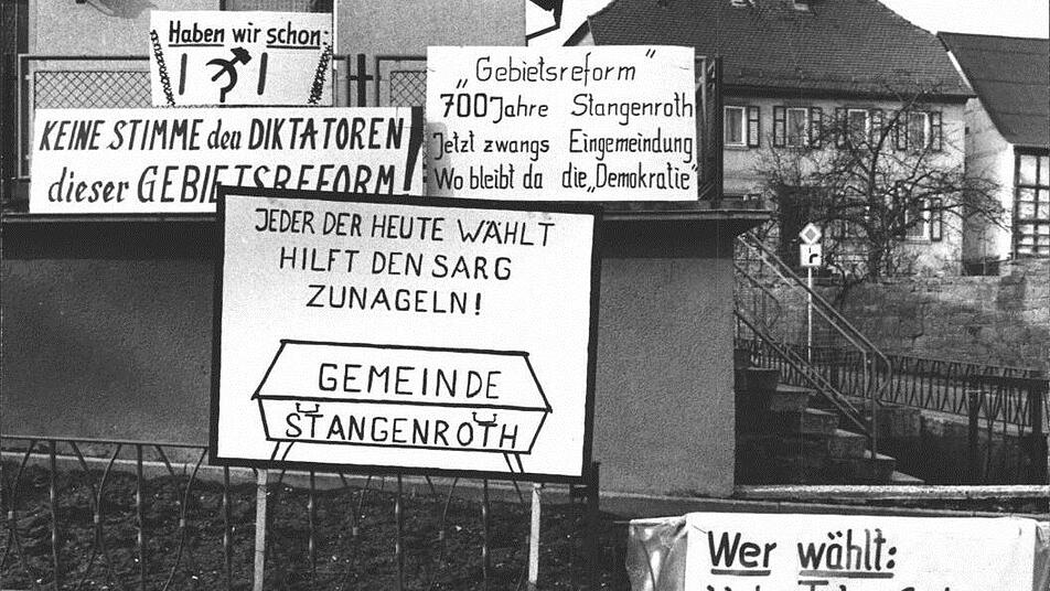Premich strebte 1977 sogar eine Normenkontrollklage beim Bayerischen Verwaltungsgerichtshof an und überlegte lange, eine Gemeinde mit den Walddörfern Schmalwasser, Langenleiten, Sandberg und Waldberg zu bilden. Die Stangenröther riefen aus Protest im Frühjahr 1978 einen Boykott der Kommunalwahl aus. Mit Erfolg: "Am Ende gingen nur zwei zur Wahl", berichtet Ernst Dettmer. Der gebürtige Schalker zog 1973 nach Stangenroth. Der Lehrer berichtete als Mitarbeiter der Saale-Zeitung über den Ort. Erich Metz, Spitzname "Napoleon", sei damals der größte Verfechter der Eigenständigkeit gewesen. "1974 bis 1976 ging's heiß her", erinnert sich der heute 71-jährige Ernst Dettmer. Ihm selbst sei mit Zwangsversetzung gedroht worden. Beim Wahl-Boykott-Aufruf wurde der Ton sogar noch rauer: "Wer hier wählt, wird gehängt" habe auf einem Plakat gestanden. Daneben stand ein Galgen, der allerdings schnell entfernt wurde. Aller Widerstand brachte nichts: Am Ende musste Stangenroth zum 1. Mai 1978 die Zwangsehe mit Burkardroth, Frauenroth, Wollbach, Gefäll, Premich, Stralsbach, Katzenbach, Lauter, Waldfenster und Oehrberg eingehen.