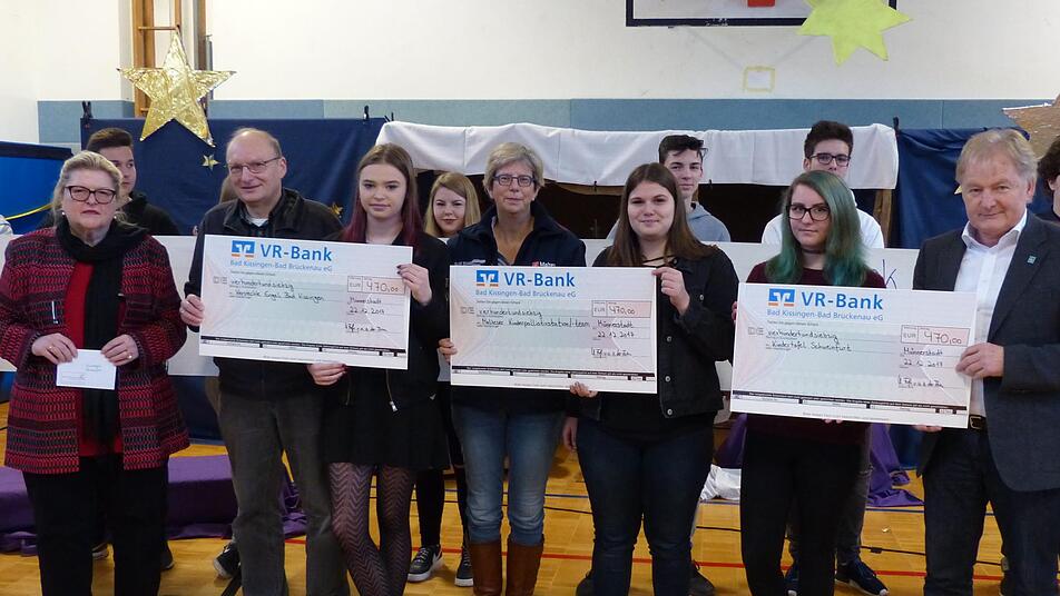 Über sportliche Schüler und soziales Engagement freuten sich Schulleiterin Freifrau Ulrike von und zu der Tann, Hartmut Grossmann von den "Versteckten Engeln" der Tafel Bad Kissingen, 3. Schülersprecherin Antonia Schölzke, Elke Schellenberger vom Malteser Kinderpalliativteam, 1. Schülersprecherin Josy Seuffert, 2. Schülersprecherin Anna Lippert und Stefan Labus von der Schweinfurter Kindertafel e. V. Alle drei Hilfsorganisationen wurden zu gleichen Teilen bedacht. Manfred Mellenthin