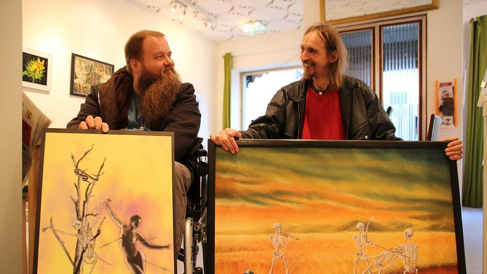 Mit ihrer Ausstellung im Altstadtcafé erfüllen sich der Münnerstädter Thomas Seuberling und der Henneberger Horst Rüggeberg einen lange gehegten Wunsch. Denn schon immer hat sie eine Gemeinschafts-Ausstellung gereizt "Utopien - ein Dialog" haben sie die Ausstellung betitelt. Dialog, weil die Bilder miteinander korrespondieren, wie Thomas Seuberling erklärt. Es gebe Arbeiten, die sich ergänzen, aber auch Bilder, die sich in Spannung gegenüberstehen.