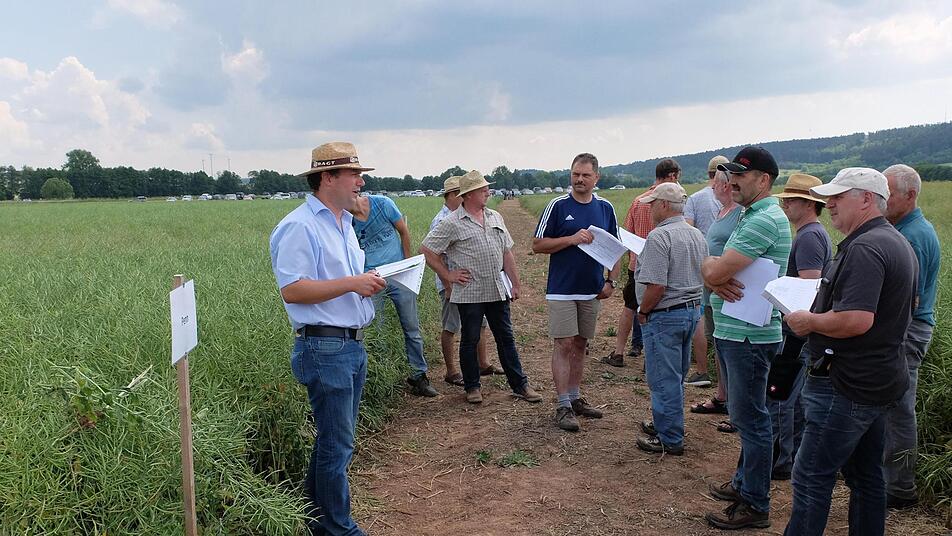 Im Wiesengrund in Burglauer brennt am Freitagnachmittag die Sonne gnadenlos auf die Äcker. Trotz der Hitze haben sich hier zahlreiche Landwirte versammelt. Sie schauen sich gerade die Demostreifen an, die Landwirt Jochen Then auf seinen Äckern gepflanzt hat. Große Schilder mit Aufschrift benennen die Art, die auf dem Streifen gedeiht. Zahlreiche Experten erklären jeweils, was die Vor- und was die Nachteile der jeweiligen Pflanzensorten sind. Dabei ist das Areal in Pflanzflächen für die verschiedenen Hauptkulturen eingeteilt. Neben Raps sind hier auch Maissorten zu sehen, Wintergerste ebenso wie Sommergerste und auch Roggen- und Triticalesorten (Kreuzung aus Weizen und Roggen).