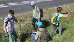 Die Schüler fuhren mit ihrem Begleit-Tross zuerst ins Industriegebiet nach Großenbrach. Dort fanden sie an einem Weg parallel zur Hauptstraße jede Menge von dem schön aussehendes, aber ziemlich giftigem Jakobs-Kreuzkraut. Sie rissen die Pflanzen samt den Wurzeln aus oder schnitten sie ab, wenn das nicht möglich war. Immer geschützt durch Handschuhe. Mit dieser Aktion sollte verhindert werden, dass sich die Pflanzen weiter ausbreiten. Ähnlich wie Löwenzahn werden die winzigen Samen durch den Wind über weite Strecken im ganzen Umkreis verteilt.