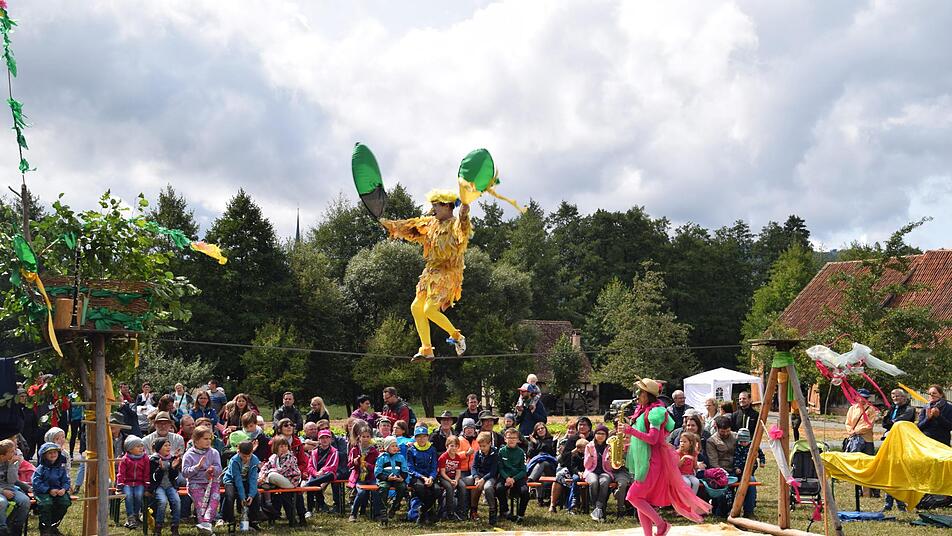 Am frühen Nachmittag fiel dann aber glücklicherweise der letzte Tropfen vom Himmel und die Sonne gewann die Oberhand. Jetzt konnte das Fest richtig beginnen. Aus allen Ecken und Winkeln, aus allen Häusern und Ställen strömten die Besucher. Da ertönte auch schon ein Trompetensignal: "Pirolino", ein prächtig gelber Paradiesvogel, lud zum "Spektakulum in luftigen Höhen" ein. Was es damit auf sich hatte, erfuhren die Gäste beim Seiltanz-Theater "Nesterwachen". Erstmals gastierten nämlich "Luftgaukler" im Fränkischen Freilandmuseum, die nicht nur einfach über das Seil balancierten, sondern dabei auch allerhand komödiantisches Können bewiesen.