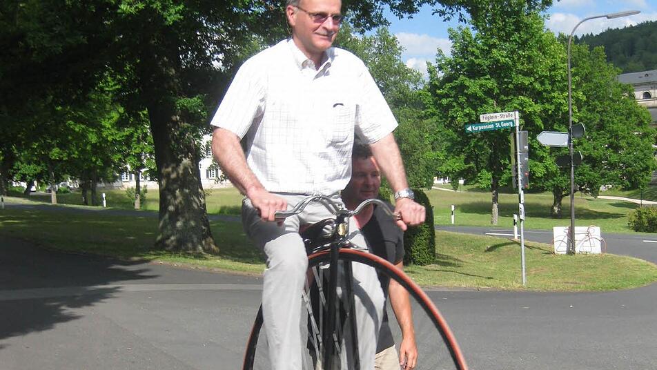 Dennoch, was dieses Museum trotz der räumlichen Enge zu bieten hat, ist ein beeindruckender Streifzug durch 200 Jahre Fahrradgeschichte: Da liegen in einer Vitrine unzählige Fahrradklingeln neben Armbanduhren ("die wurden für die Radler erfunden"), da sind "Waffen" zu sehen, mit denen man sich die damals gerne freilaufenden Hunde vom Hals - pardon, vom Bein - hielt. Nicht fehlen durfte zum Abschluss eine Tour auf dem Hochrad - dass es dazu einer komplett anderen Technik bedarf als beim zeitgenössischen Fahrrad, spürten die Kreisräte Stefan Lang, Roland Limpert und Beatrix Lieb, die den Mut aufbrachten, das Hochrad zu besteigen.