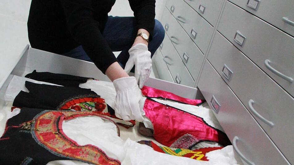 Ihr großer Stolz ist die Abteilung im dritten Stock des Depot-Turms: "Textil". Christiane Landgraf ist Bezirkstrachtenberaterin und weiß genau, welcher Trachten-Stil aus welcher Ecke Unterfrankens stammt. In riesigen grauen Schubladen liegen die bunten Schürzen, Mieder und Kleider geordnet nebeneinander. Röcke werden gerollt, Metallapplikationen dürfen nicht aufeinander liegen. Die 59-Jährige hat es auf besondere Stücke abgesehen. In den Schränken lagert mehr Festtagskleidung als Alltagskluft. "Uns fehlen Arbeitsklamotten von Männern. Die sind aufgetragen worden."