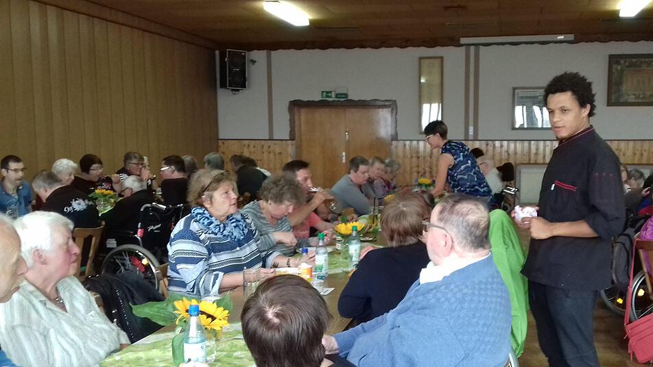 Knapp 60 Personen aus dem Landkreis Bad Kissingen hatten sich nach Stangenroth auf den Weg gemacht, wobei auch wieder der Fahrdienst vom BRK Bad Kissingen im Einsatz war. Die Feldköche der Freiwilligen Feuerwehr Stangenroth unter der Leitung von Kevin Kungu haben sich derweil um das Mittagessen gekümmert. Diesmal wurde auf den Aufbau der Feldküche verzichtet und die Küche in der Rhönfesthalle genutzt. Das Essen wurde sehr gelobt und eine Besucherin meinte zu Kevin Kungu: "Die Frau, die Sie einmal bekommt, hat es gut". Nach dem Mittagessen fand dann ein Wortgottesdienst statt, der von Diakon Michael Sell organisiert worden war. Dies freute die Teilnehmer sehr und sie sangen bei den Liedern kräftig mit.