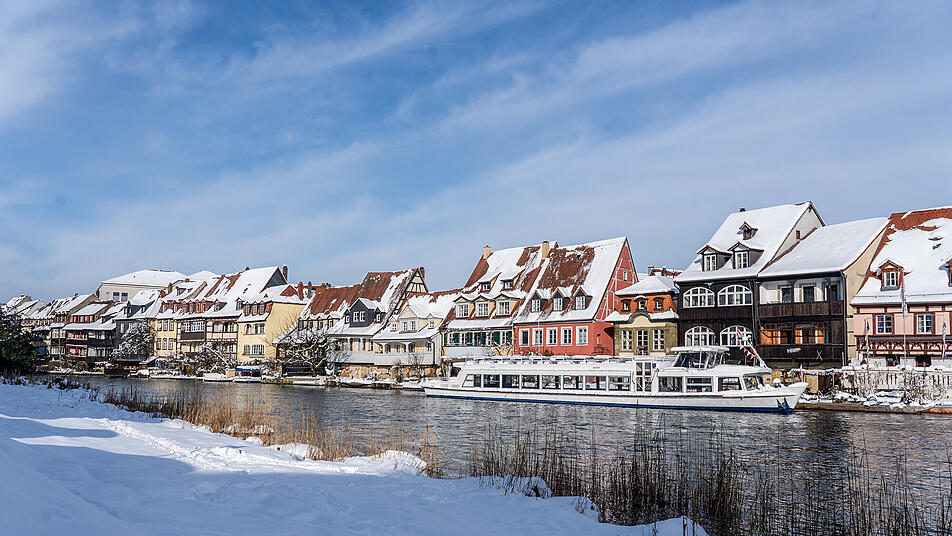 Verschneite Häuserreihe am Wasser in Bamberg. Ein weißes Boot fährt auf dem Fluss, während dichte Schneewehen den Rand bedecken. Klarer blauer Himmel ergänzt das Winterwunder.
