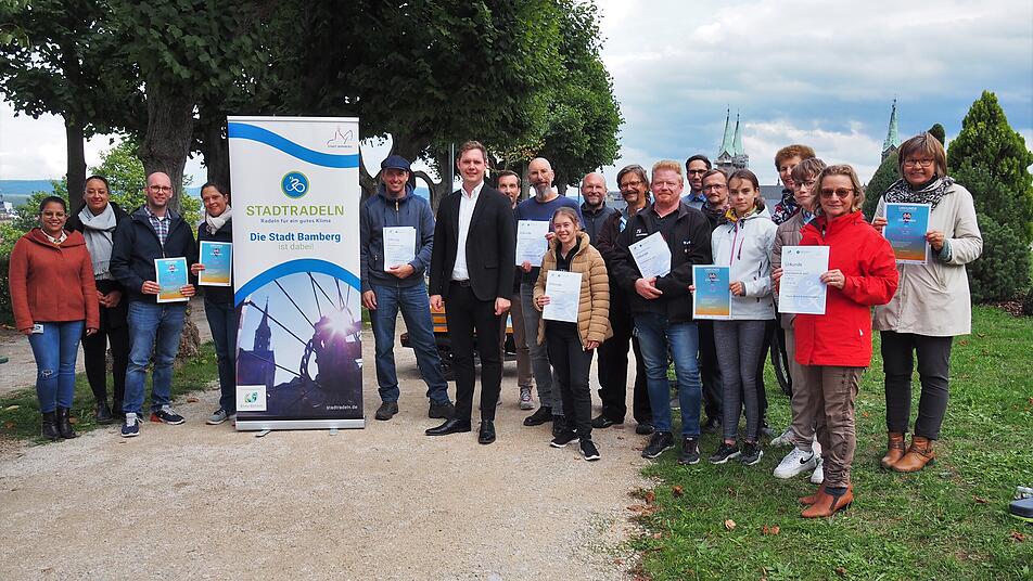 1837 aktive Radelnde in 100 Teams haben sich im dreiwöchigen Aktionszeitraum von "Stadtradeln" in Bamberg beteiligt. Wie die Stadt Bamberg berichtet, kamen vom 20. Juni bis 10. Juli 2022 insgesamt knapp 360.000 Kilometer zusammen, wodurch 55 Tonnen CO2 vermieden wurden. „In der Gemeinschaft für ein gutes Klima zu radeln ist besonders motivierend und macht Spaß“, sagte Zweiter Bürgermeister und Mobilitätsreferent Jonas Glüsenkamp (Grüne) bei der Ehrung der besten Teams auf der Terrasse am Michelsberg. Familie, Freunde, Firmen, Vereine, Schulen und Kindergärten konnten mitmachen. In etlichen Gewinnkategorien gab es tolle Prämien zu erradeln.