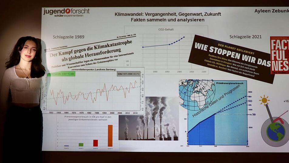 Positiv sei der starke Anstieg der erneuerbaren Energien in Stadt und Landkreis Bamberg zu erwähnen, der von 190 Millionen kWh im Jahr 2008 auf 690 Millionen kWh gesteigert werden konnte, heißt es. Dennoch schaue die Schülerin mit Sorge in die Zukunft, da der Anteil der fossilen Brennstoffe "nicht in dem gewünschten Maße reduziert werden konnte". Ayleen habe Oberfranken in den Geo- und Raumwissenschaften beim Landeswettbewerb Jugend forscht / Schüler experimentieren am 8. und 9. April 2022 in Regensburg vertreten.