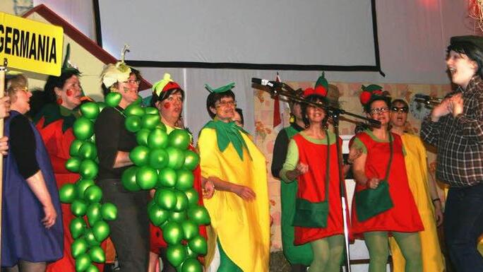 Ein Highlight hat wieder der Singkreis aus Unterneuses präsentiert. Als freche, leckere Früchtchen boten die Frauen mit Gesang und witziger Show wieder einen bunten Einblick in ihre Gedankenwelt. "Sag mir wo die Autos sind...?" Nachdem die Autos in Unterneuses durch die Umgehung und dem neuen Radweg immer weniger werden, hatten sie die Idee, die Touristen mit Bootsfahrten über die Rauhe Ebrach zu locken. "Das Bürgermeisterlein packte sein Badehöslein ein" und ging ins Bamberger Bad - der hatte dann den genialen Geistesblitz - ein Burgebados muss her.