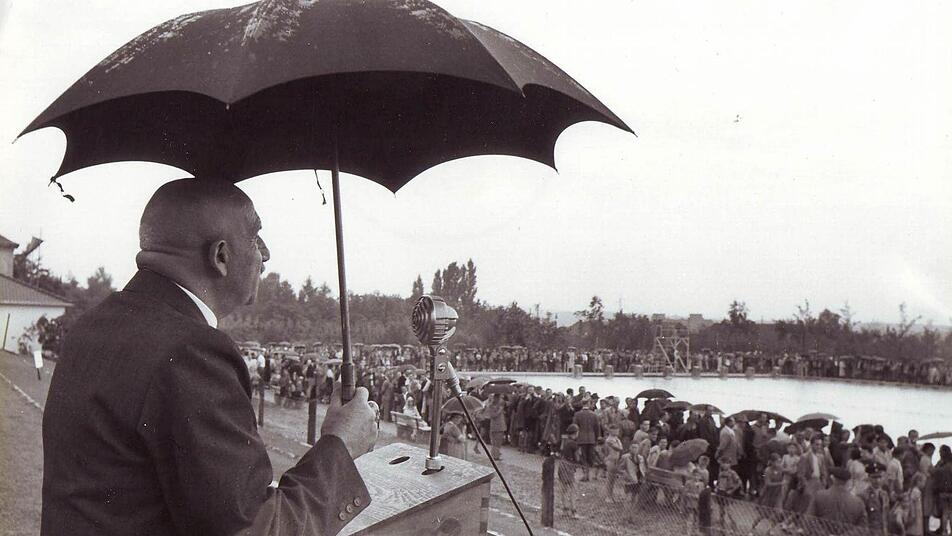 Ja, der Wettergott begoss die Eröffnung des Stadionbades auf eigene Weise und ließ sämtliche Festgäste im Regen stehen. Was Luitpold Weegmann nicht davon abhielt, feierliche Worte zu sprechen - als OB und Schirmherr der Veranstaltung. Nach zähem Ringen war auf der ehemaligen Aschehalde schließlich das erste zeitgemäße öffentliche Bad mit einem Nichtschwimmer- und Schwimmerbecken, einem Ein-Meter- und Drei-Meter-Sprungturm entstanden. Und von Letzterem "sprangen als Erste die damaligen Stadtverbandsvorsitzenden Rolf Weyermann und Max Gardill ins glasklare Wasser", wie sich Willy Heckel in "Bamberg im 20. Jahrhundert" zurückerinnerte.