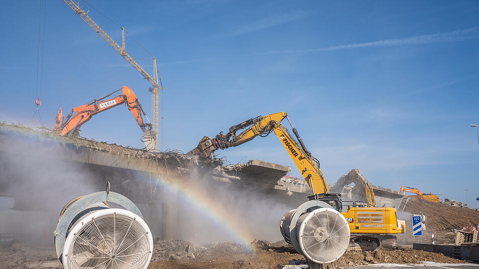 Auf der Autobahn A9 bei Bayreuth laufen an diesem Wochenende spektakuläre Abbrucharbeiten: Die Hochbrücke Bayreuth wird abgerissen und gleichzeitig finden Arbeiten am Brückenbauwerk an der Anschlussstelle Bindlacher Berg statt. Das berichtet die Nachrichtenagentur News5. Aufnahmen der Agentur vom Samstag, 7. März 2026, zeigen schwere Baumaschinen bei den Abrissarbeiten an der Brückenkonstruktion.