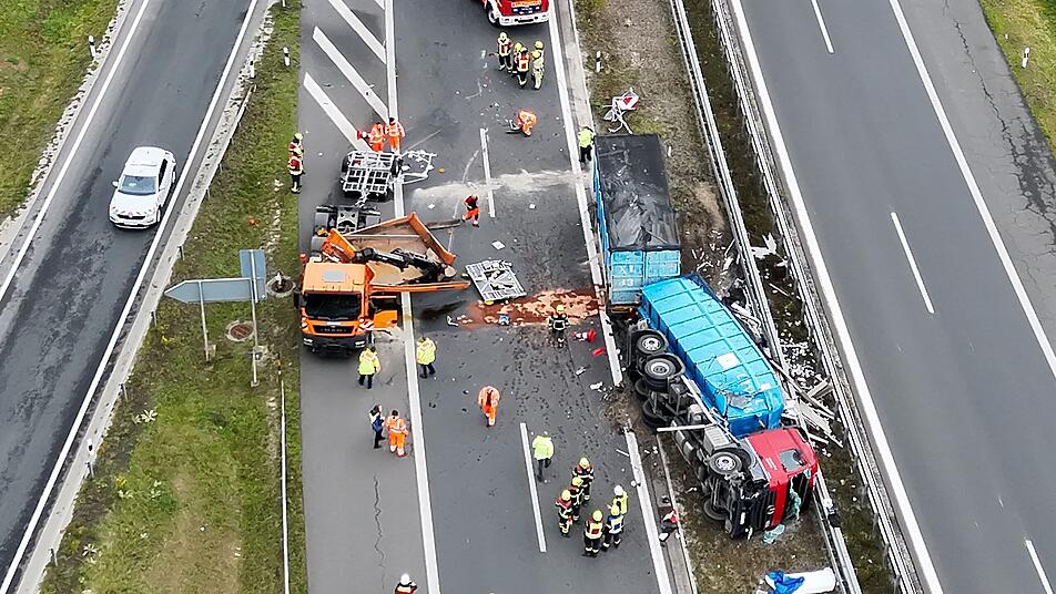 Die Bergung der beschädigten Fahrzeuge gestaltete sich als schwierig: Eine Spezialfirma rückte mit Kran und schwerem Gerät an. Der 40-Tonnen schwere Laster musste laut einem Polizeisprecher aufgerichtet werden. Auch ein Helikopter und eine Drohne waren im Einsatz. Die A73 wurde in nördlicher Fahrtrichtung bis etwa 18 Uhr gesperrt; der Verkehr wurde umgeleitet. Der Schaden wird auf rund 200.000 Euro geschätzt. sbu/mit dpa
