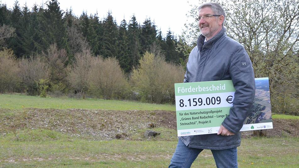 "Der Weg von der Idee eines Naturschutzgroßprojekts in unserer Region bis hin zur Umsetzung, dem so genannten Projekt II, dieser Weg war ein langer und steiniger Weg", sagte Coburgs Landrat Michael Busch (SPD) als er am Freitag in seiner Eigenschaft als Vorsitzender des Zweckverbands für das Projekt aus den Händen des Amtschefs im Bayerischen Umweltministerium, Christian Barth, den symbolischen Scheck über 8,159 Millionen Euro entgegen nahm.