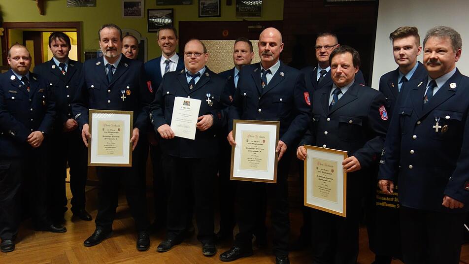 Ehrungen: Holger Taubmann (staatliches Ehrenzeichen für 25 Jahre aktiven Dienst), Peter Schlag, Matthias Schneider (Jahresspange für zehn Jahre), Kai Heinlein, Günter Heubner (20).