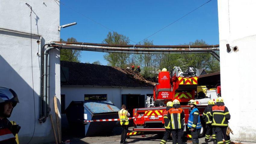 Weil Einsturzgefahr drohte, wurde auch das Technische Hilfswerk alarmiert, um gegebenenfalls das Gebäude zu sichern. Bürgermeister Marco Steiner (FW) machte sich vor Ort ein Bild. rlu