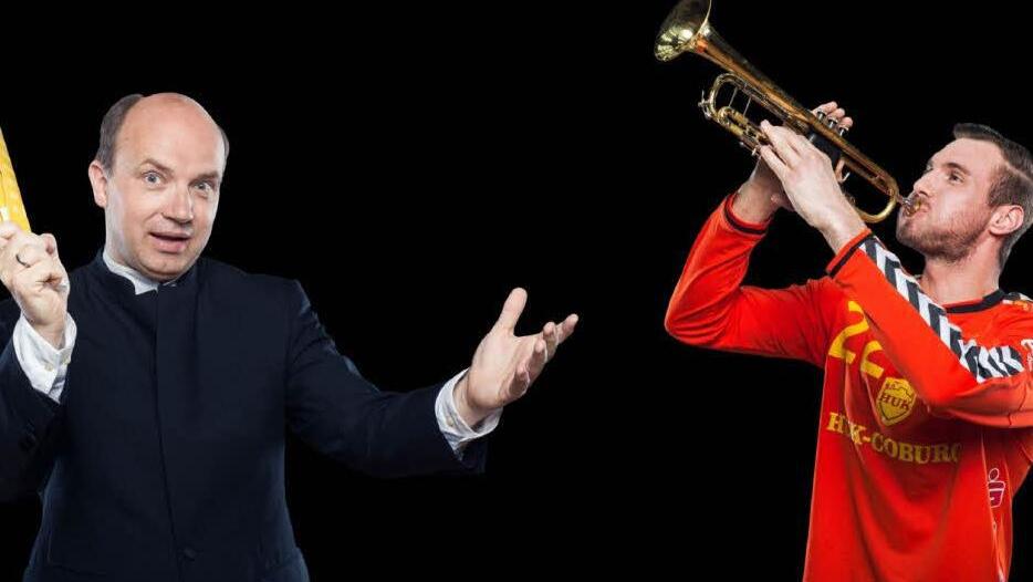 Sind HSC-Torhüter Oliver Krechel und Kreisläufer Dominic Kelm unter die Musiker gegangen? Als Trompeter und Geiger werben Krechel und Kelm jedenfalls im HSC-Trikot für ein ganz und gar außergewöhnliches Konzertprojekt. "Handball-Sinfonie" lautet das Motto für ein Event, das das Landestheater gemeinsam mit dem ambitionierten Handball-Zweitligisten HSC 2000 Coburg in der HUK-Arena planen.