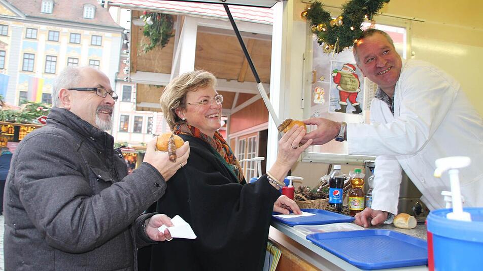 Zum Beweis, dass alle von der guten Qualität der Coburger Bratwürste überzeugt sind, lassen sich Monika Hohlmeier, Jürgen W. Heike, Ralf Luther und Joachim Grosch auf dem im Aufbau befindlichen Weihnachtsmarkt eine Bratwurst schmecken. Auch die Zweite Bürgermeisterin Birgit Weber (CSU) gesellt sich dazu. Sie versichert, dass auch die Stadtspitze nichts auf den Weg bringen werde, was sich im Zusammenhang mit der Coburger Bratwurst als kontraproduktiv erweisen würde.