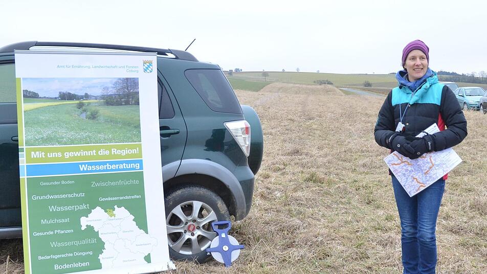 "Im Landkreis Coburg ist der Raum Meeder mit den Wassereinzugsflächen der Fließgewässer Sulzbach und Nerde eines der oberfränkischen Modellgebiete Gewässerschutz", erklärte Gesche Petersen. Sie ist eine von vier Wasserberatern in Oberfranken. Am Beispiel einer Ackerfläche erklärte sie vor Ort die Wirkung von Erosionsschutzstreifen. Landwirte erhalten Förderung, wenn sie solche Streifen anlegen. Das kann entlang von Gewässern geschehen oder an Ackerflächen im Gefälle. Ziel ist stets, durch einen Vegetationsstreifen zu verhindern, dass ausgewaschene Bodenbestandteile in Gewässer gespült werden. "Die Erosion der Ackerfläche wird dadurch allerdings nicht verhindert", stellte Gesche Petersen klar. Eine deutliche Erosionsrinne im Acker oberhalb der Beispielfläche und ausgeschwemmter Boden, der im Grünstreifen hängen geblieben ist, zeigt deutlich, was sie damit meint.