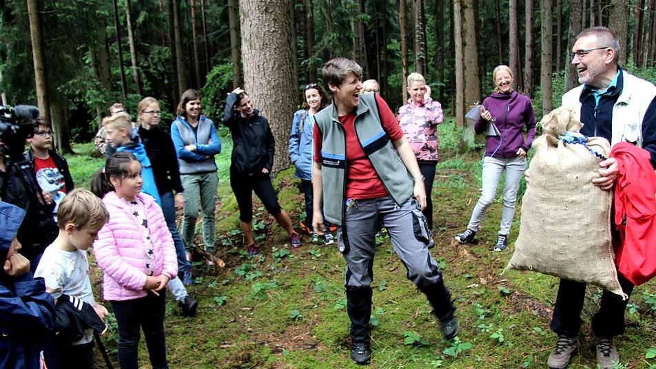 Bei den Stationen hieß es zum Beispiel: "Welche zehn Dinge gehören nicht in den Wald?" Und das war eine ganze Menge, was vorher hinter Bäumen und unter Büschen versteckt worden war. In zugedeckten Kisten mussten die Kinder fühlen, was sich darin befindet. Sportlich ging es beim Zapfenwerfen zu.