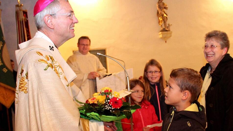 Gerne sei er nach Adelsdorf gekommen, sagte der Erzbischof zu Beginn. Nach der Altarweihe im Jahr 2003 und dem Kirchenjubiläum 2009 war dies nun sein dritter Besuch in der Aischgründer Kirche. "Ihr seid eine lebendige, engagierte, dynamische Pfarrei!", lobte er die Gläubigen. Bürgermeister Karsten Fischkal (FW) hieß ihn in seiner Gemeinde willkommen und überreichte ihm als Gastgeschenk ein paar Laufschuhe. "Diese Schuhe werden mich beim Laufen immer an das schöne Fest erinnern", meinte der Erzbischof und lächelte.