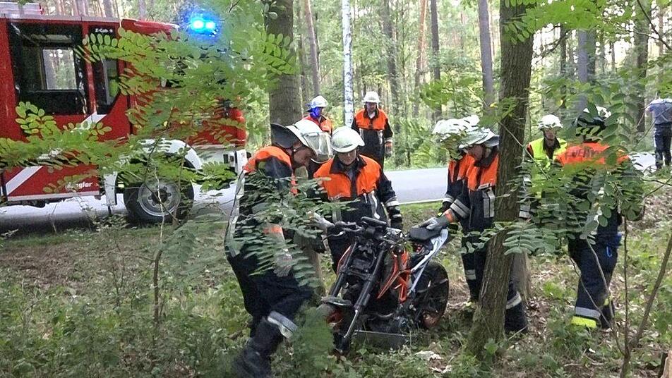 In einer Kurve kam der junge Mann alleinbeteiligt in einer Kurve nach links von der Fahrbahn ab und schlitterte an mehreren Bäumen vorbei, bevor das Motorrad gegen einen Baum prallte und Totalschaden erlitt.
