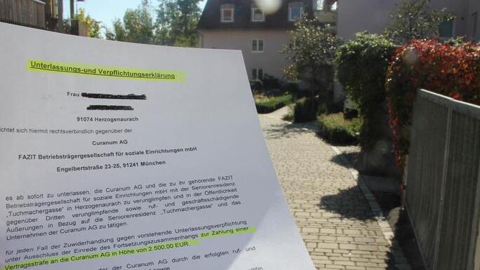 Dass es zu Veränderungen im Hause in Folge des Zeitungsartikels kam, bestätigten die Beschwerdeführerin ebenso wie Bewohner im Haus und auch Pflegepersonal. Es kam aber auch zu der Erklärung. Um diesem neuen Schreiben Nachdruck zu verleihen, wird zum einen gleich darauf hingewiesen, dass "für den Fall der Zuwiderhandlung gegen die Unterlassungsverpflichtung (...) die Zahlung einer Vertragsstrafe an die Curanum AG in Höhe von 2500 Euro" fällig sei. Außerdem sei der Schaden der AG zu ersetzen, der durch die vermeintliche ruf- und geschäftsschädigende Äußerung entstanden sei.