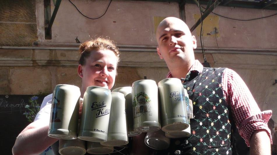 Alex selbst ist kein hauptberuflicher Kellner, hat aber schon Erfahrung mit großen Volksfesten. Wie auch Susan, die schon auf dem Oktoberfest, dem Wasen in Stuttgart oder der Kiliani in Würzburg bedient hat. "Ohne Erfahrung zur Bergkirchweih zu gehen wäre der Untergang", sagt Alex.