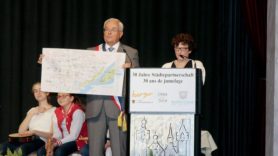 "Das ist heute eine besondere Feierstunde und wir haben die Feier der Jumelage extra auf Himmelfahrt gelegt, weil sich da auch traditionell die Freundeskreise der beiden Städte treffen", erklärte Bürgermeister Hacker. So waren die Mitglieder des Freundeskreises Herzogenaurach-Sainte-Luce-sur-Loire beim Festabend ebenso vertreten wie der Cercle d´Amis Sainte-Luce-sur-Loire und natürlich auch Stadträte beider Städte.