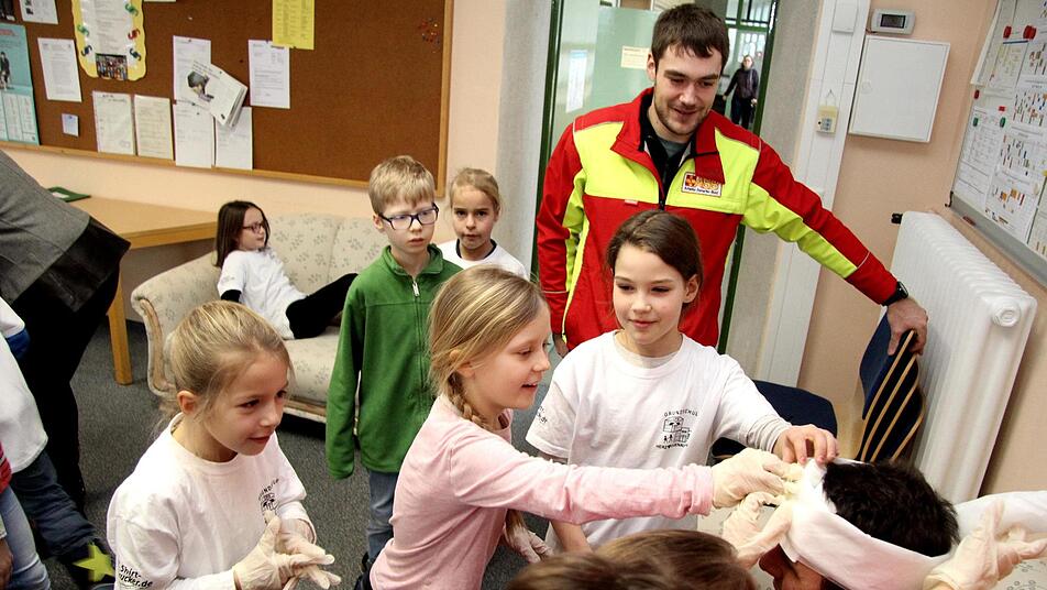 Die Klasse war vorher schon etwas aufgeregt, schließlich wussten sie nicht, was der ASB-Ausbilder alles sehen wollte. Im Lehrerzimmer ließ Konrektorin und Klassenlehrerin Heidi Forisch die Kinder erzählen, was sie in ihrer mehrmonatigen Ausbildung gelernt hatten. Da schwirrten Begriffe wie Druckverband, behandeln von Schnitt- und Brandwunden und Schocklage durch die Luft.