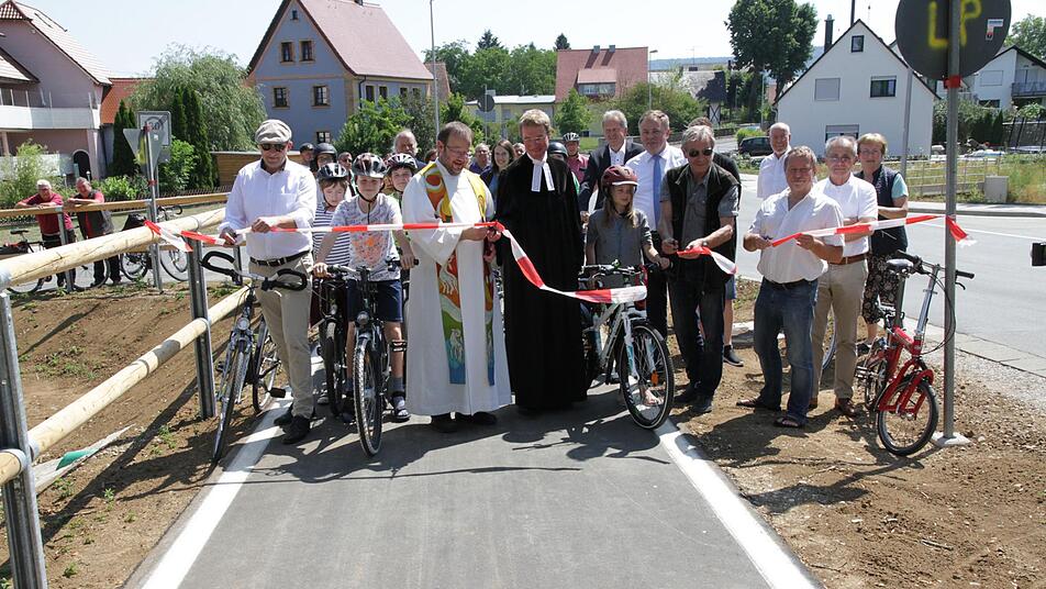 Weitere 50 000 Euro der Baukosten trägt der Landkreis, weil der Radweg die Kreisstraße, die über die Autobahn führt, kreuzt. Und auch die Gemeindeverbindungsstraße kreuzt die Autobahn. "In guter Zusammenarbeit mit der Autobahndirektion Nordbayern konnte die Sanierung der Brücke über die Autobahn so erfolgen, das der Radweg nun in Regelbreite darüber hinweg führt", bedankte sich Schwarzmann. Die geplante Bauzeit konnte indes nicht eingehalten werden. Eigentlich sollte das Bauwerk schon im Herbst 2017 fertig sein. Es entstanden jedoch einige Bauverzögerungen, insbesondere witterungsbeding, führte Schwarzmann aus. Ursprünglich waren für den Bau des Radweges rund 736 000 Euro veranschlagt. Mit der Gesamtsumme von schließlich 1 007 000 Euro lag man am Ende rund 270 000 Euro darüber. Die feierliche Einweihung der neuen Radstrecke, die auch eine Querverbindung zum Regnitztal-Radweg darstellt, nahmen Pfarrer Daniel Schuster und sein evangelischer Kollege Pfarrer Ulrich Bahr vor.