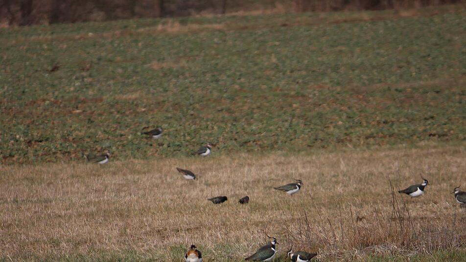 Bestimmt 30 Vögel mit einer "Holle" am Kopf sitzen auf den Wiesen und picken im Gras nach Futter. "Holle" nennt man das Federbüschel, das fröhlich wippt, wenn sich der Vogel bewegt. Was beim Anblick der Vielzahl wie ein Massenobjekt wirkt, ist in Wahrheit ein seltenes Schauspiel und nur noch ein oder zwei Tage lang zu sehen: Kiebitze auf der Durchreise.