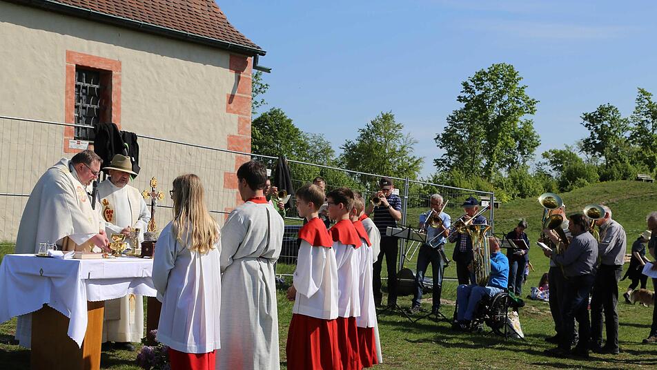 Die Blasmusik von Wiesenthau-Schlaifhausen begleitete den Gottesdienst musikalisch. Viele hatten so Getränke und Brotzeit in Rucksäcken und Taschen dabei. Für einen gemütlichen Ausklang in der Natur war so bestens gesorgt.