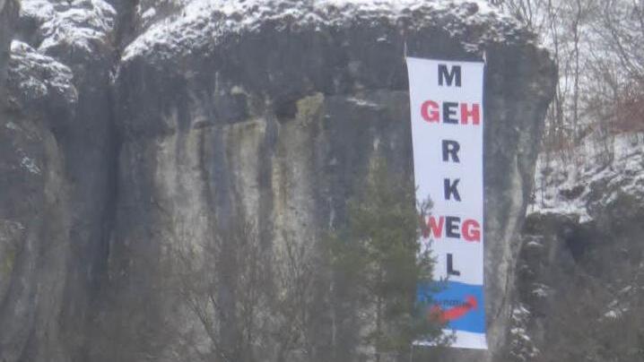 Ein riesiges Transparent an der größten Felswand, dem so genannten Aussichtspunkt Johannesburg in der Karl-Brückner-Anlage zwischen Behringersmühle und Gößweinstein mit der Aufschrift "MERKEL GEH WEG" und einem Logo, das der Partei Alternative für Deutschland (AfD) nachempfunden ist, sorgt für Aufregung in Gößweinstein. In der Nacht auf Dreikönig hatten Unbekannte dieses mehrere Meter große Transparent fachmännisch mit Karabinerhaken am Felsen befestigt.