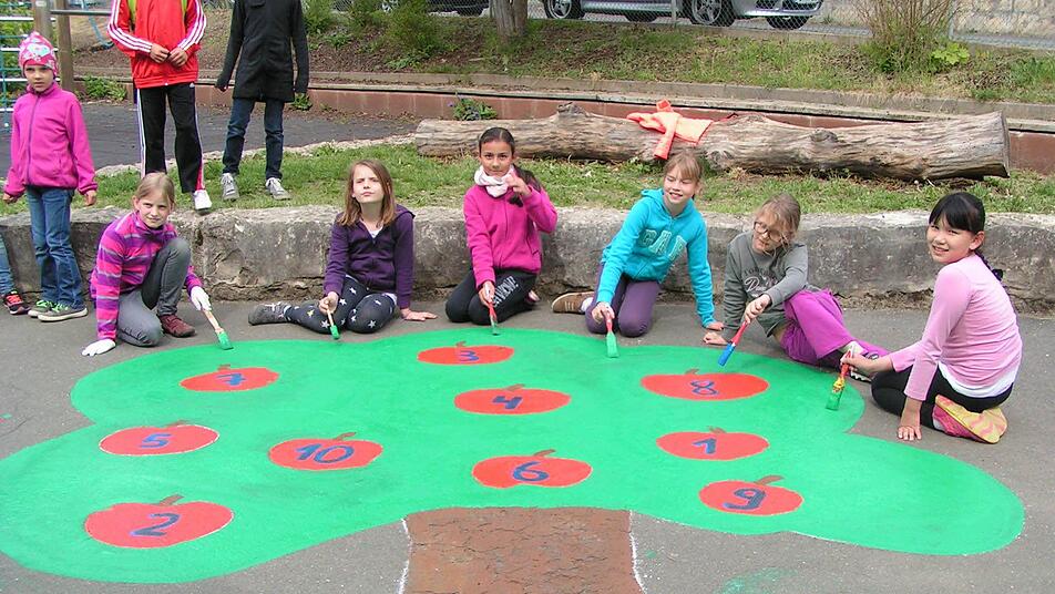 In alten Klamotten, mit Farbdosen und Pinseln machten sich die Mädchen und Buben der 3. und 4. Klasse daran, Leben und Farbe auf ihren Pausenhof zu zaubern. Allerdings auch mit einem pädagogischen Hintergrund: Angeregt wurde die Malaktion vom Elternbeirat, der den Kindern behilflich war. Begeistert darüber zeigten sich Schulleiterin Andrea Kohl und Lehrerin Regina Bappert.