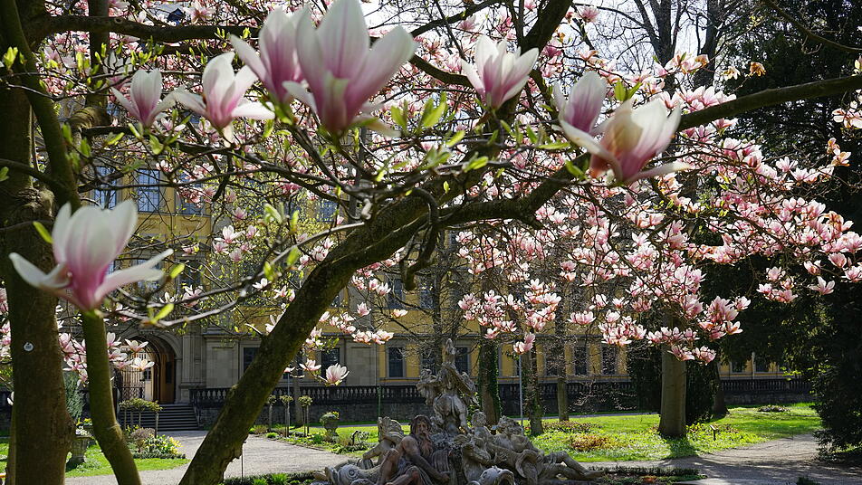 Auch im Schlossgarten in Erlangen blühen Magnolien. Das Areal zählt zu den bedeutendsten historischen Gartenanlagen Frankens. Angelegt im frühen 18. Jahrhundert, gehört er heute zu den schönsten Stadtparks der Region. Seit 1849 ist der Schlossgarten der allgemeinen Bevölkerung zugänglich .
