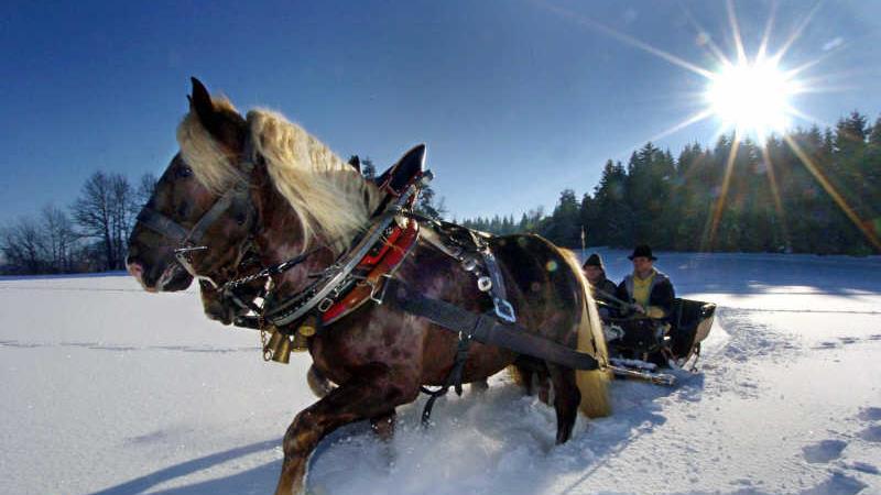 In gemütlichem Tempo durch die verschneite Landschaft zuckeln, die Aussicht genießen und unter der warmen Decke zusammenrutschen: Eine Fahrt im Pferdeschlitten ist ideal für Romantiker, Naturliebhaber und Familien. Je nach Anzahl der Passagiere ab etwa 10 Euro pro Person geht das beispielsweise in Hohenberg im Kreis Wunsiedel, in Kleintettau im Frankenwald im Kreis Kronach und in Kirchensittenbach im Nürnberger Land. Und wenn der Schnee für den Schlitten nicht reicht, gibt's Kutschfahrten.