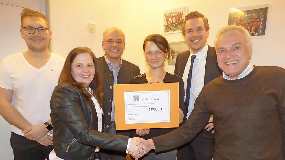 Zur Mitgliederversammlung des SV Gößweinstein war Aldi-Regionalleiter Johannes Moosmeier mit der Gößweinsteiner Aldi-Marktleiterin Iris Schüpferling und ihrer Stellvertreterin Susan Behr gekommen, um für die Jugendarbeit des Vereins eine Spende in Höhe von ganz genau 2395,56 Euro zu übergeben. Dieser Betrag kam bei der Ein-Jahres-Feier des Gößweinsteiner Aldi-Marktes in nur einer Stunde als Einnahmen herein, als Bürgermeister Hanngörg Zimmermann (BMG) als Supermarktkassier an der Kasse saß.