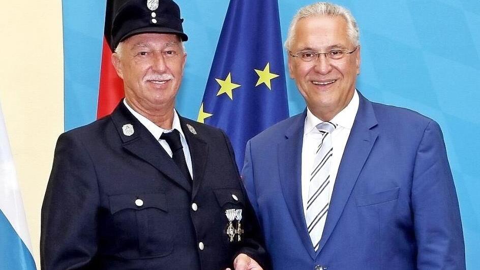 Bayerns Innerminister Joachim Herrmann hat erstmals 29 ehrenamtliche Einsatzkräfte mit dem neuen Großen Ehrenzeichen für 50 Jahre aktiven Dienst bei der Feuerwehr und anderen Hilfsorganisationen ausgezeichnet. Darunter mit Dieter Baier von der Feuerwehr Falkendorf einen Ehrenamtlichen aus dem Landkreis.