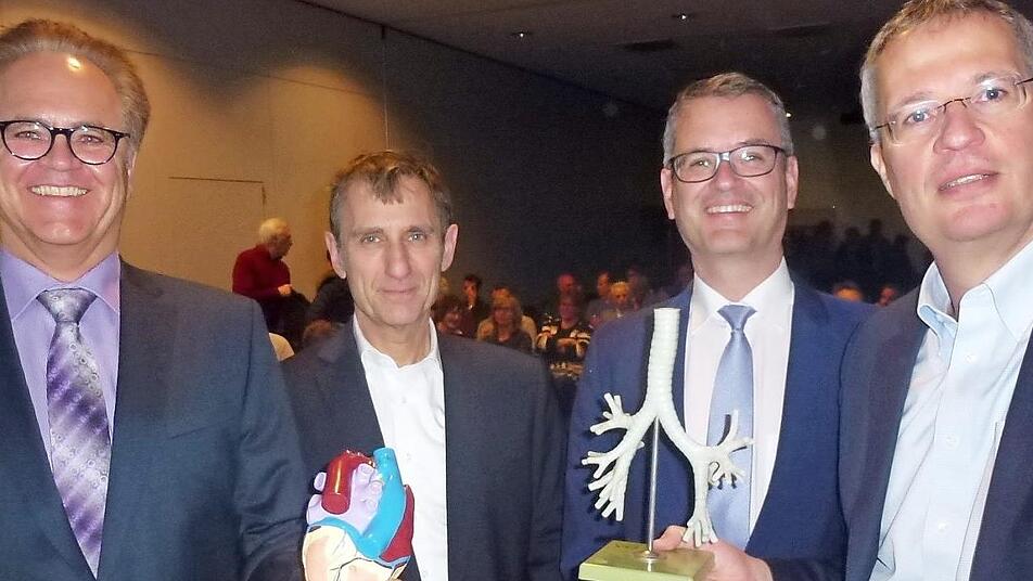 Über 160 Ärzte waren zum "Update Innere Medizin" in das Hotel "Novina" in Herzogenaurach gekommen. Der Herzogenauracher Kardiologe Hilmar Dittrich als Moderator begrüßte Dieter Schwab, Falk-Karsten Pohle (beide Martha-Maria-Krankenhaus) und Joachim Ficker vom Klinikum Nürnberg (v. l.), die neue Erkenntnisse auf den Gebieten Pneumologie, Gastroenterologie und Kardiologie präsentierten. Foto: Leo Hildel